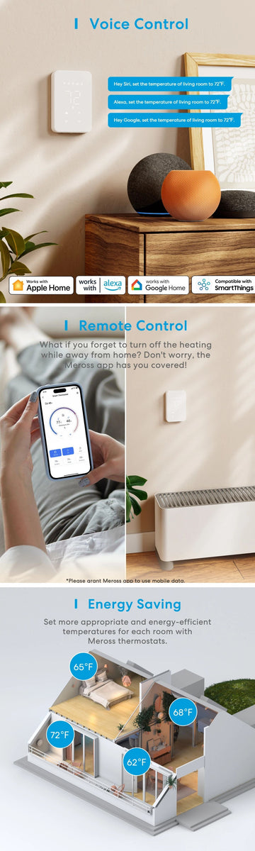 - Meross Smart Thermostat: Elevate your home heating with the Meross HomeKit Wi-Fi Smart Thermostat. Boasting a pure white LED touch display, accurate temperature control, and advanced features like open window detection and real-time energy monitoring. Enjoy energy efficiency, childproof settings, and weekly programmable options for a tailored, eco-friendly heating experience. Compatible with Siri, Alexa, Google Assistant, and control remotely via the Meross app.