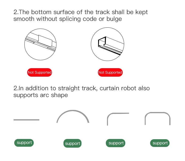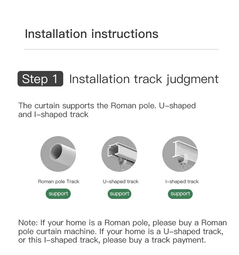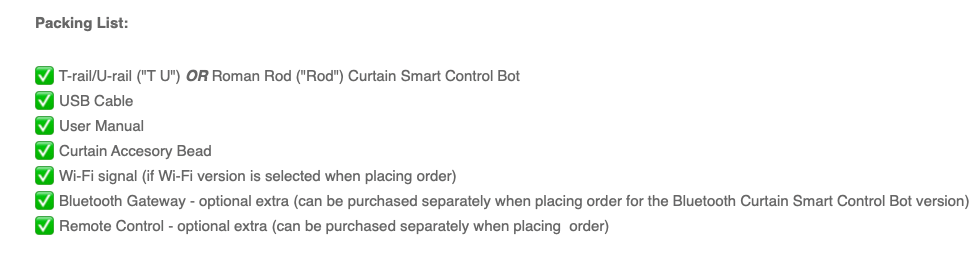 - Ensure that the correct Curtain Smart Control Bot for your type of curtain rail is selected when placing your order, i.e. T-rail/U-rail ("T U") OR Roman Rod rail ("Rod").