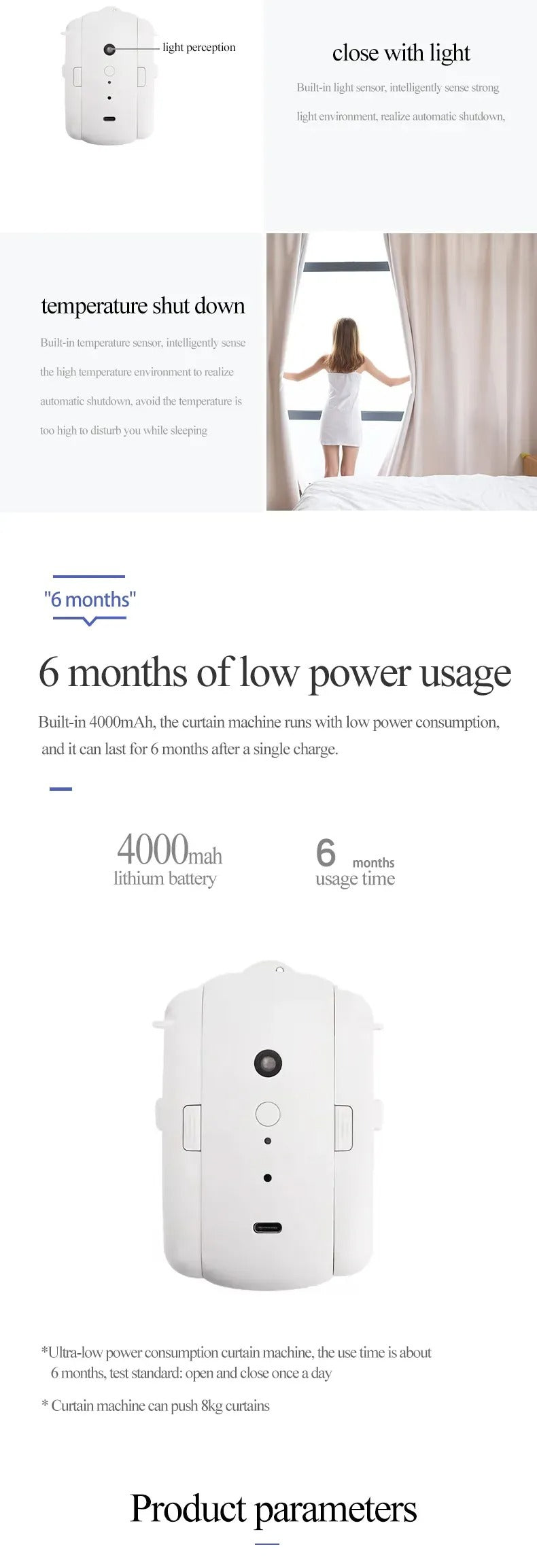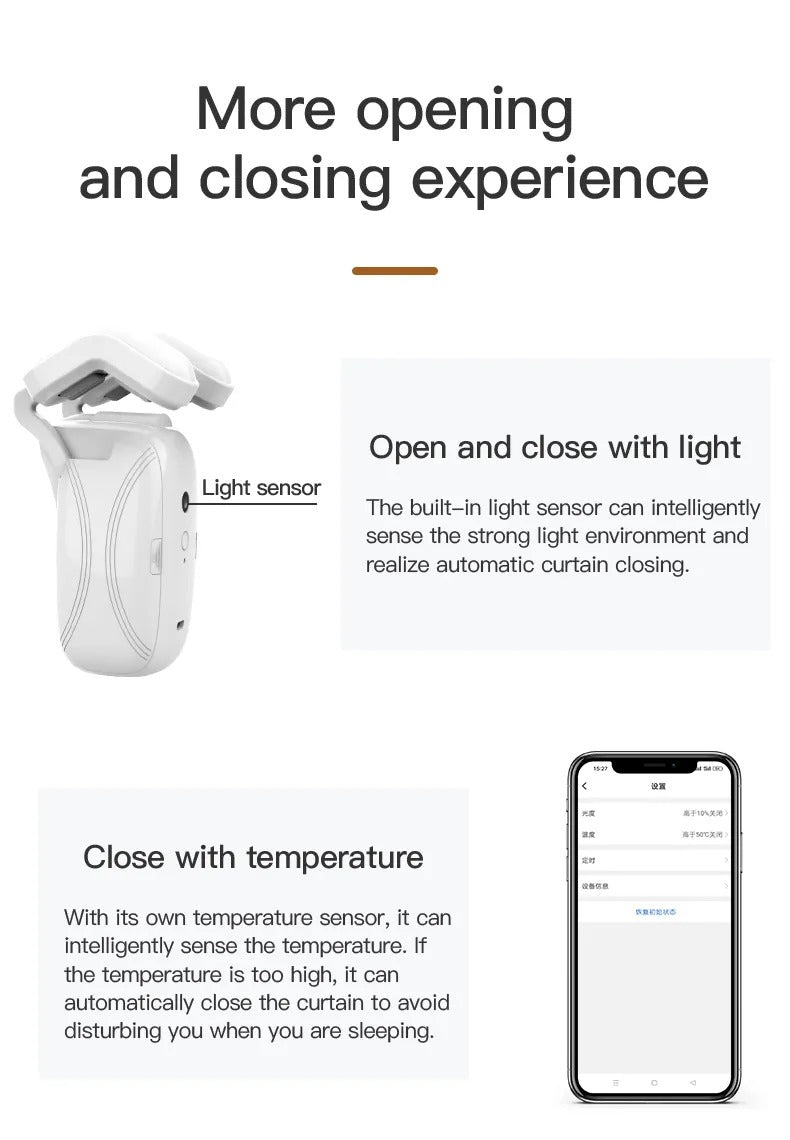 Experience the future of curtain control with Curtain Smart Control Bot, the cutting-edge solution that revolutionizes how you control your curtains. Open and close your curtains effortlessly with the intuitive app, and enjoy features like graffiti control, automatic closure based on light and temperature, remote control compatibility, and integration with Alexa and Google Assistant, the Curtain Smart Control Bot offers the ultimate convenience and automation for your home.