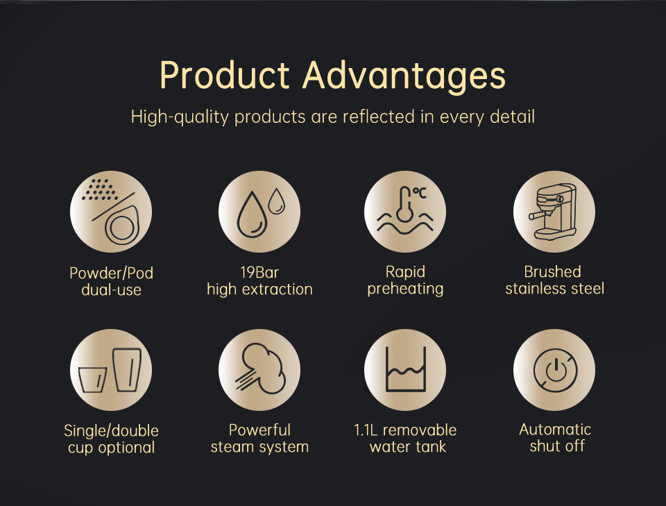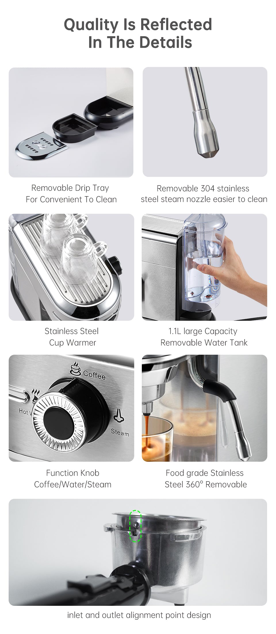 It's a masterpiece of coffee craftsmanship, redefining your daily coffee rituals. This slim and elegant 19 Bar espresso machine is designed for true coffee enthusiasts who demand perfection in every cup. With rapid preheating, dual-use versatility for both coffee powder and ESE PODs, and a powerful steam system, it delivers rich crema and precise coffee flavors in just 25 seconds. The compact design not only fits seamlessly into any kitchen space but also offers easy maintenance with a removable drip tray and stainless steel components. Elevate your coffee experience to new heights with the HiBREW Coffee Maker Slim Cafetera and savor the essence of barista-quality espresso moments in the comfort of your own home."
