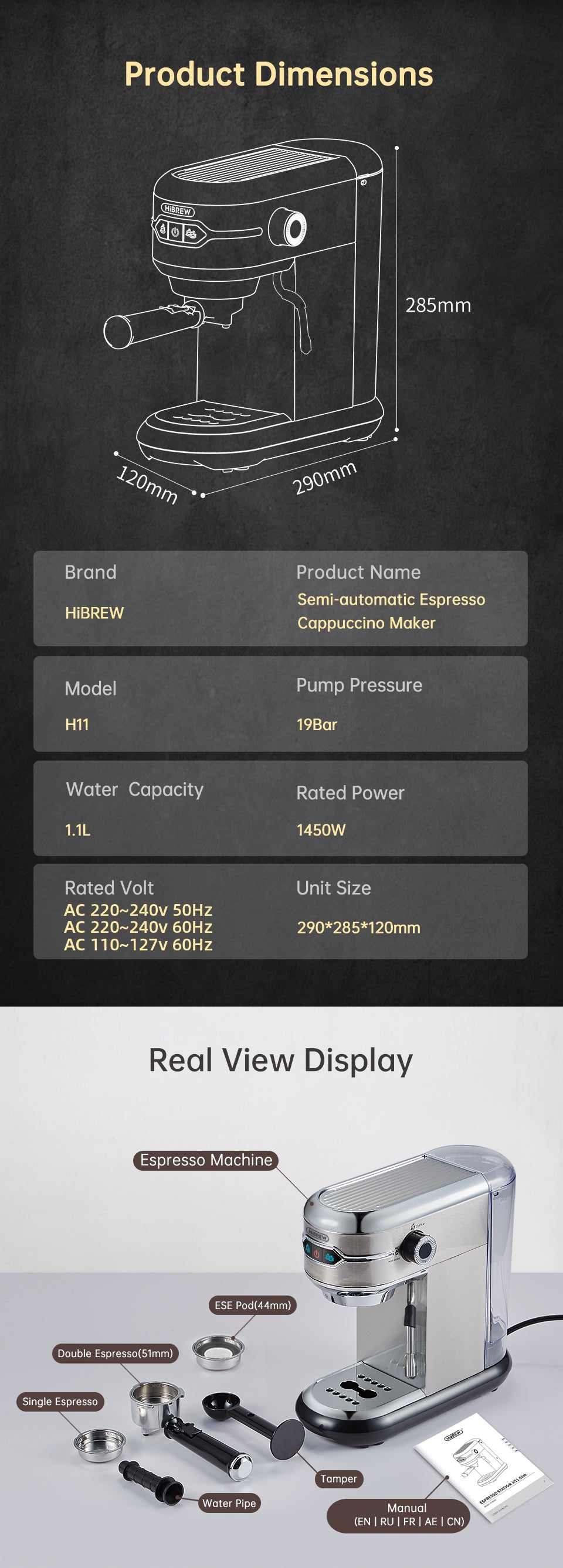 Elevate your coffee experience with the HiBREW Coffee Maker Slim Cafetera. This super slim 19 Bar espresso machine offers rapid preheating, dual-use for powder and ESE POD, and a powerful steam system. Create rich crema and precise coffee flavors in just 25 seconds. Its compact design fits any space, and the removable drip tray and stainless steel components ensure easy maintenance.