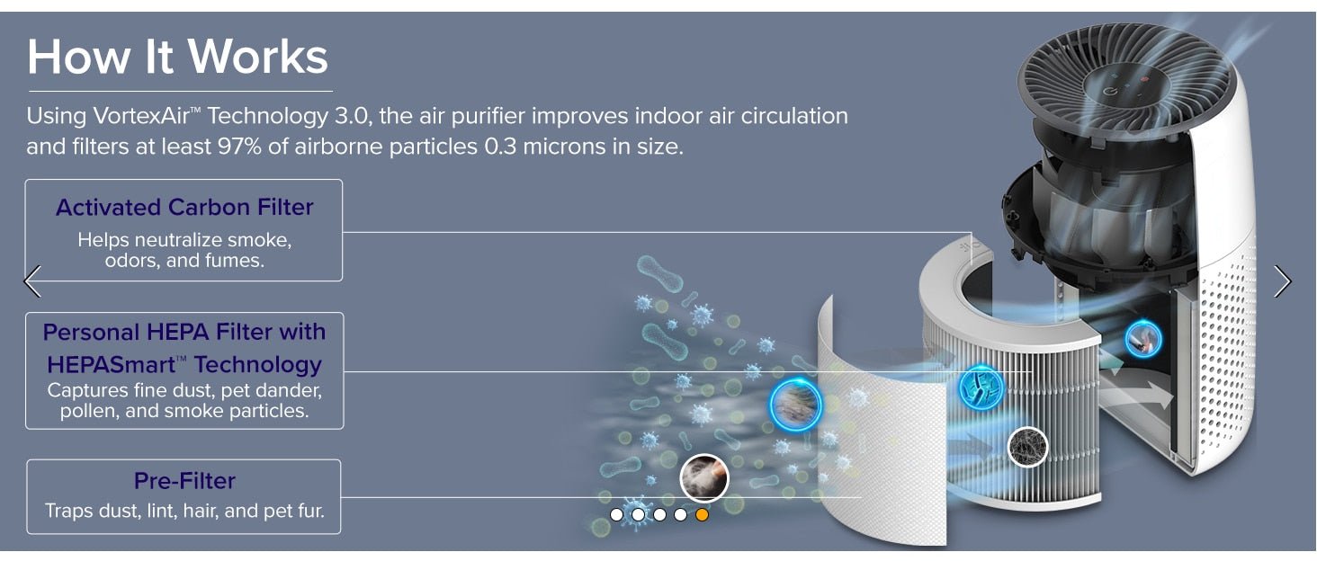• 3-Stage Filtration: Traps smoke, odors, and at least 97% of airborne particles 0.3 microns in size, including fine dust, pollen, and pet dander. The Activated Carbon Filter absorbs smoke, odors, and fumes.
