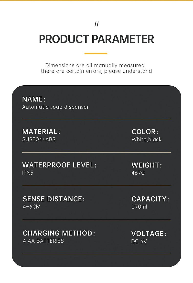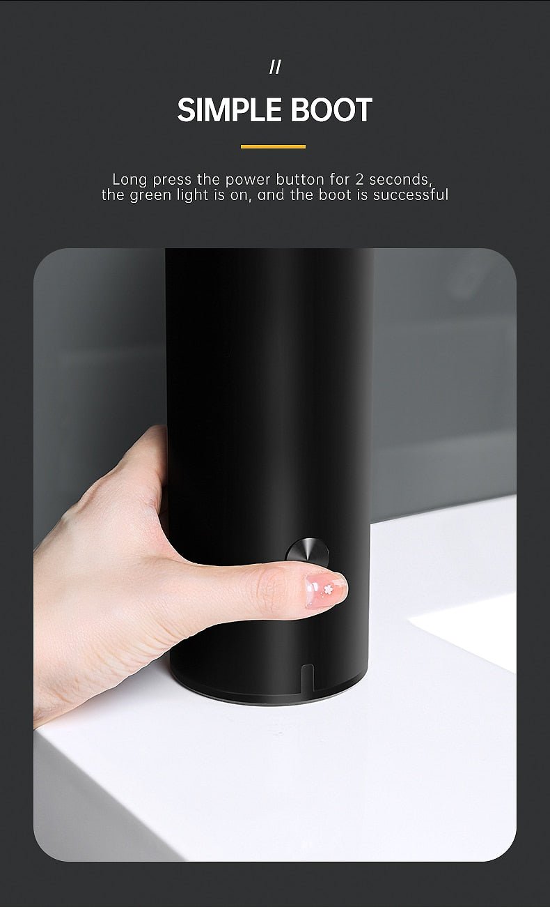 Elevate your hygiene routine with the Modern Automatic Liquid Soap Dispenser. Crafted from premium ABS material, its sleek and minimalist design brings a touch of luxurious hotel-inspired elegance to your home. This intelligent dispenser features an infrared sensor for quick, silent, and non-contact liquid dispensing, making it suitable for soap, shampoo, sanitizer, and more. With three adjustable liquid output settings, a right-angle design to prevent splashes, and extended outlet for added convenience, it offers both style and functionality. Battery-powered and IPX5 waterproof, it's the perfect addition to your daily routine.