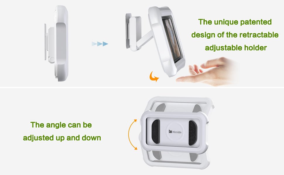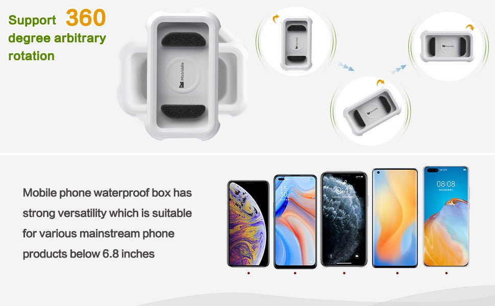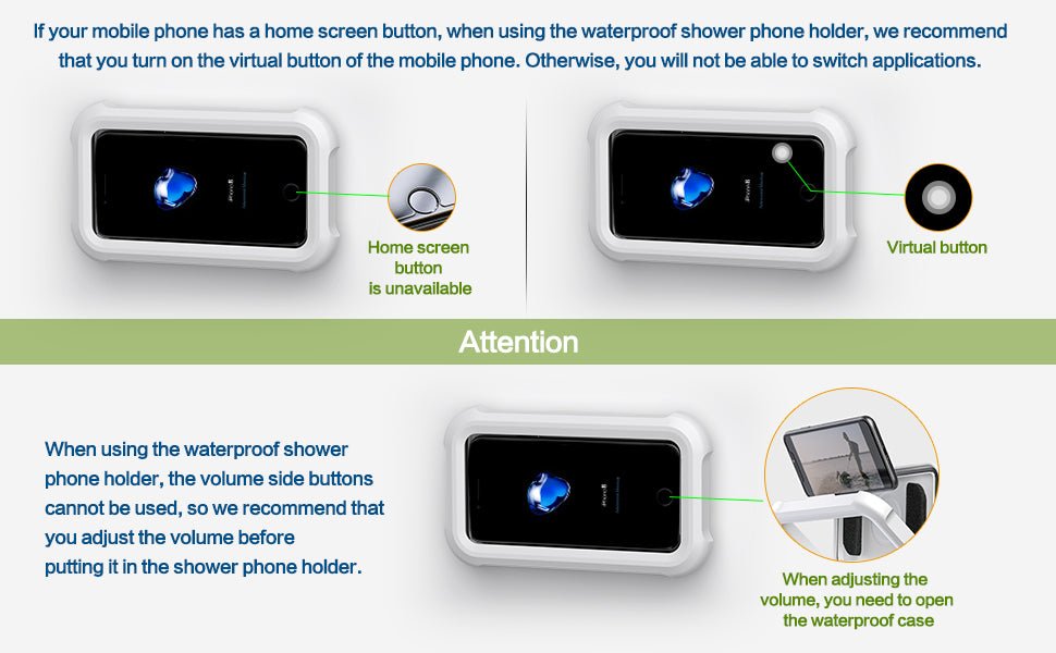 Introducing our innovative and unique HydroHold Shower Phone Holder with 480° rotation! This patented waterproof holder offers angle adjustability and easy retraction, ensuring the perfect screen display. Made with high-quality materials, it's IPx6 waterproof and anti-fog, making it ideal for bathrooms and kitchens. The 3mm HD touchable screen allows easy access to your phone while you enjoy a relaxing shower. Suitable for most phones up to 6.8 inches. No drilling required for installation.