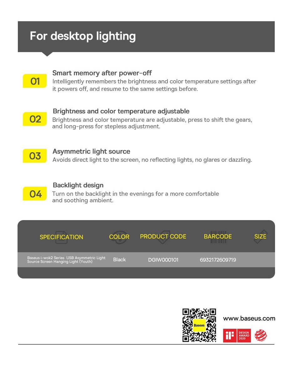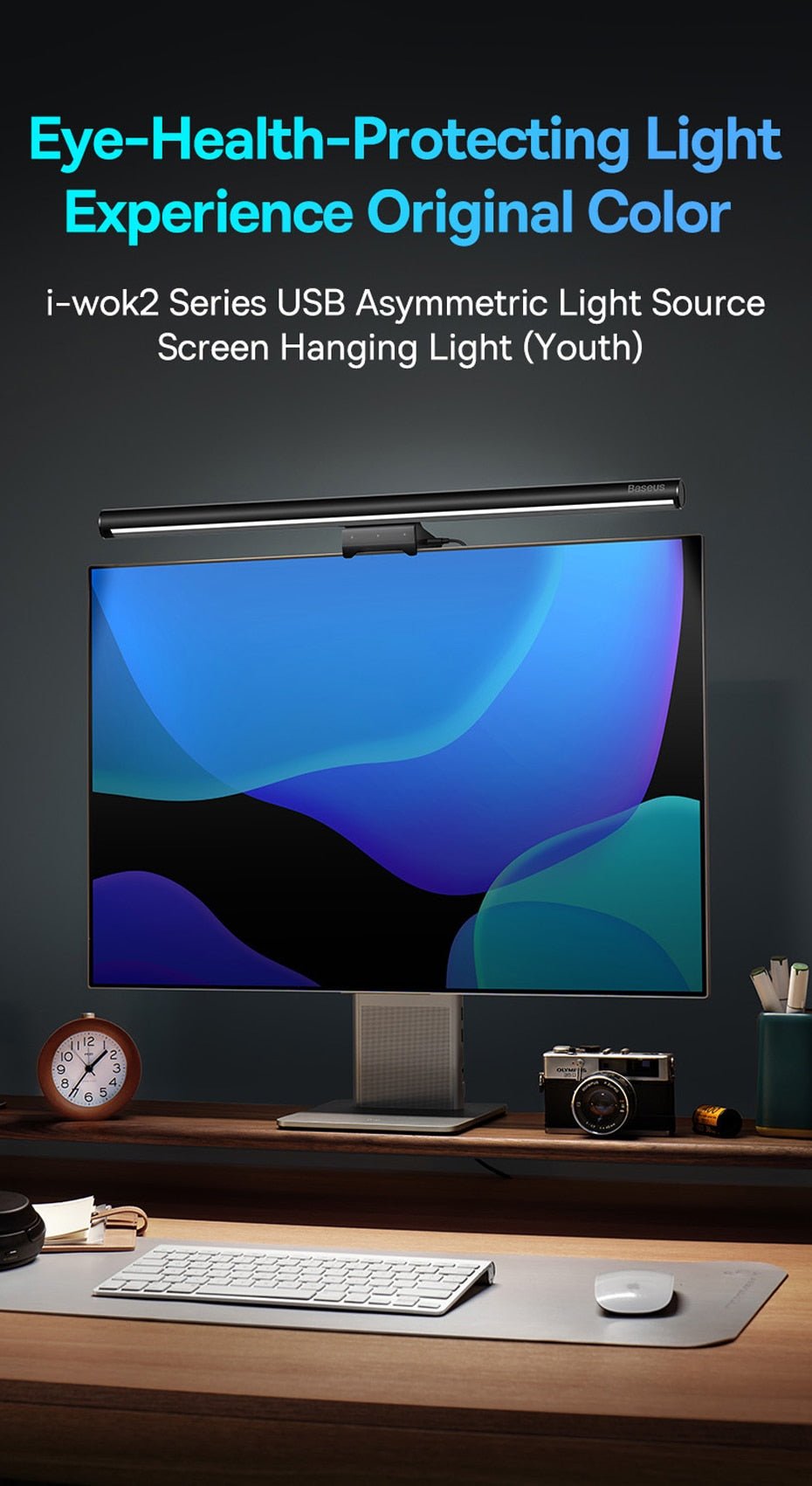 Discover the BASEUS Smart Adjustable Ergonomic Screen Lamp – an ergonomic lamp designed to enhance productivity and protect your eyes. Its asymmetric light source, full spectrum color rendering, and touch control offer ultimate comfort. Reduce eye fatigue and enjoy true colors in your workspace. The double illumination brightens your work area, while the USB power ensures convenience. Experience optimal lighting with a bi-directional rotating light tube and steady triangular support. in a fast heat dissipating frosted aluminum alloy design. Experience optimum eye-comfort and boost productivity for your study, work, or leisure with this innovative and ergonomically designed lamp.